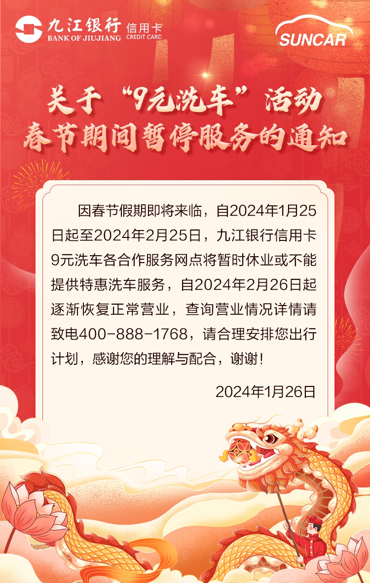 關于“9元洗車”活動春節(jié)期間暫停服務的通知