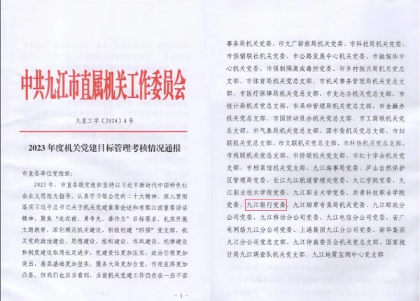 3月28日,2024年度全市機(jī)關(guān)黨的工作會議召開,市直機(jī)關(guān)工委在會上通報(bào)了2023年度機(jī)關(guān)黨建目標(biāo)管理考核情況,九江銀行黨委獲評“2023年度機(jī)關(guān)黨建工作優(yōu)秀單位”,這是九江銀行連續(xù)第六年獲此殊榮。