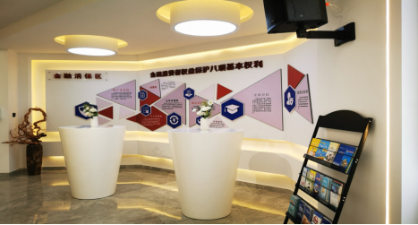 ?。ㄋ模┙鹑谙^(qū):整面定制廣告造型,以白+紅+藍(lán)的顏色呈現(xiàn),暗藏?zé)魩?,介紹金融消費(fèi)者八項(xiàng)基本權(quán)利:財(cái)產(chǎn)安全權(quán)、知情權(quán)、自主選擇權(quán)、公平交易權(quán)、依法求償權(quán)、受尊重權(quán)、受教育權(quán)、信息安全權(quán)。