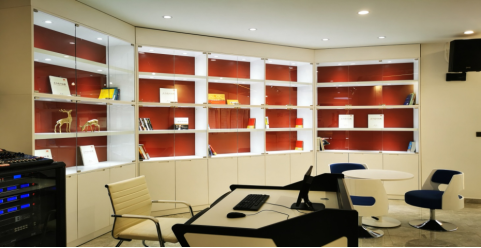 (六)互動(dòng)交流/意見(jiàn)征集區(qū):整面定制柜體,以白+紅的顏色呈現(xiàn),用于展示相關(guān)金融物品,例如宣傳手冊(cè)、金融書籍等。同時(shí)放置沙發(fā)用于討論交流,提出意見(jiàn)及建議。