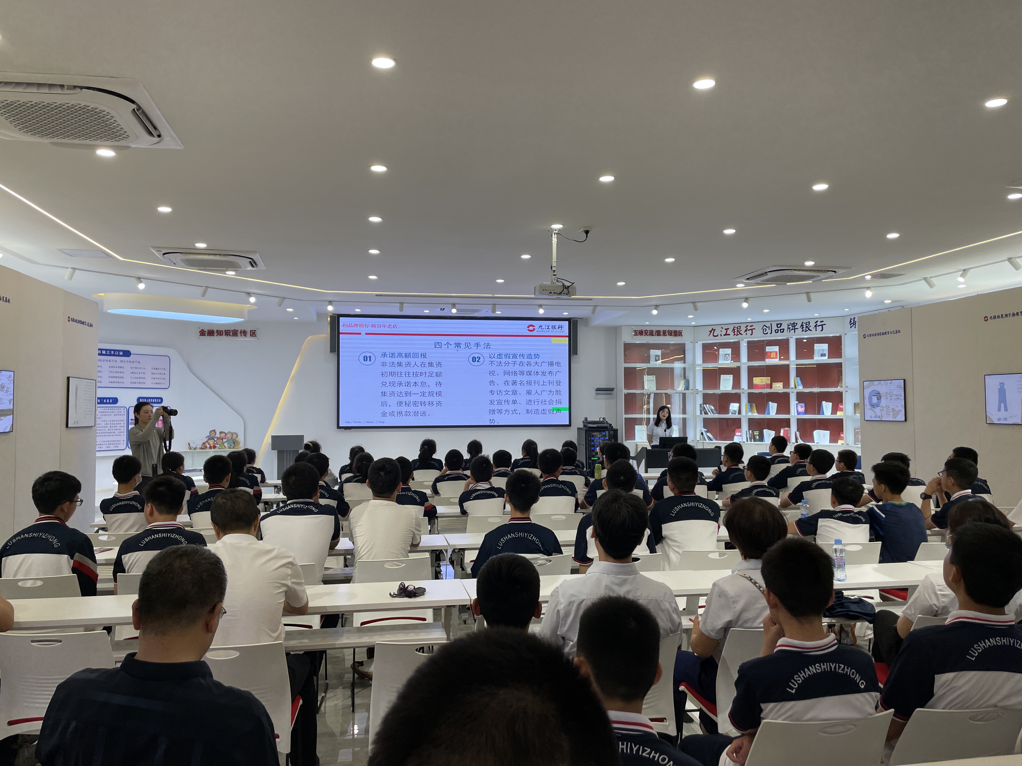 啟動(dòng)儀式結(jié)束后,我行在示范基地向在校師生進(jìn)行了集中授課,并通過參觀基地、觀看視頻、發(fā)放折頁等方式向廣大師生普及防范電信詐騙、防范非法集資、識別假幣、拒絕校園貸等金融知識。本次金融宣傳涉及800余人次,宣傳活動(dòng)成效顯著。
